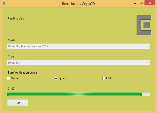• CopyCD is made with the approved Reuschtoos program sources. The software is thus small and reliable and at the same time independent of .NET and other secondary libraries. The installation of CopyCD takes less than 1 second.